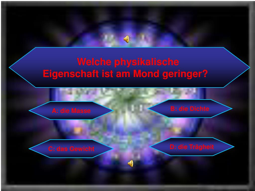 Welche physikalische Eigenschaft ist am Mond geringer? B: die Dichte A: die Masse D: die Trägheit C: das Gewicht