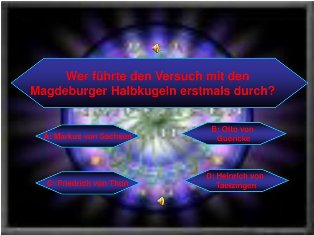 Wer führte den Versuch mit den Magdeburger Halbkugeln erstmals durch? B: Otto von Guericke A: Markus von Sachsen D: Heinrich von Taetzingen C: Friedrich von Thun