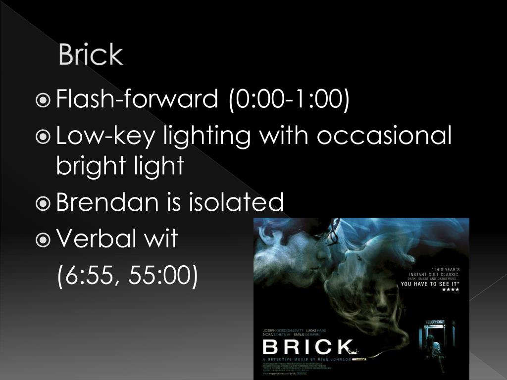 Brick • Flash-forward (0:00-1:00) • Low-key lighting with occasional bright light • Brendan is isolated • Verbal wit (6:55, 55:00)