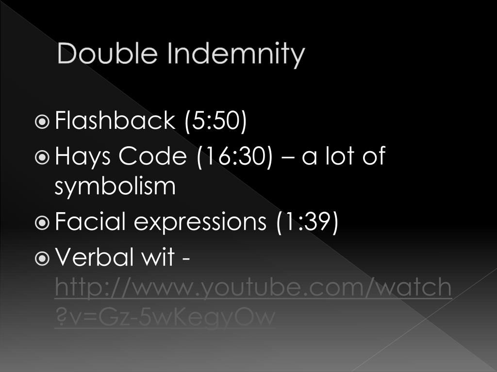 Double Indemnity • Flashback (5:50) • Hays Code (16:30) – a lot of symbolism • Facial expressions (1:39) • Verbal wit - http://www.youtube.com/watch?v=Gz-5wKegyOw