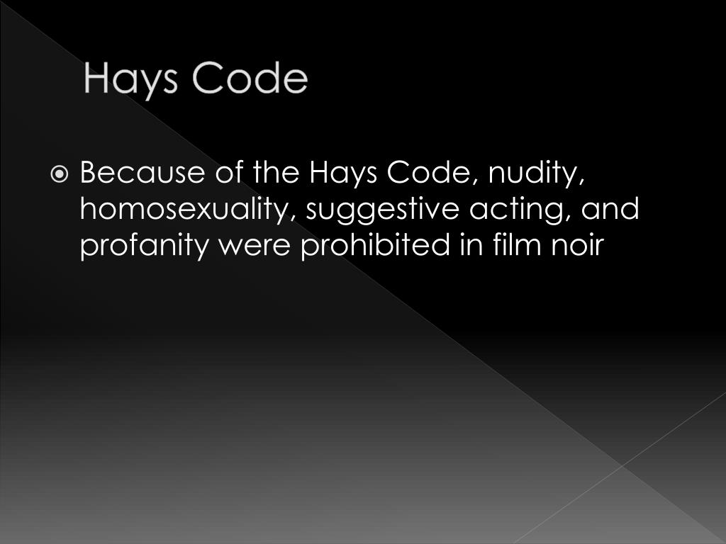 Hays Code • Because of the Hays Code, nudity, homosexuality, suggestive acting, and profanity were prohibited in film noir