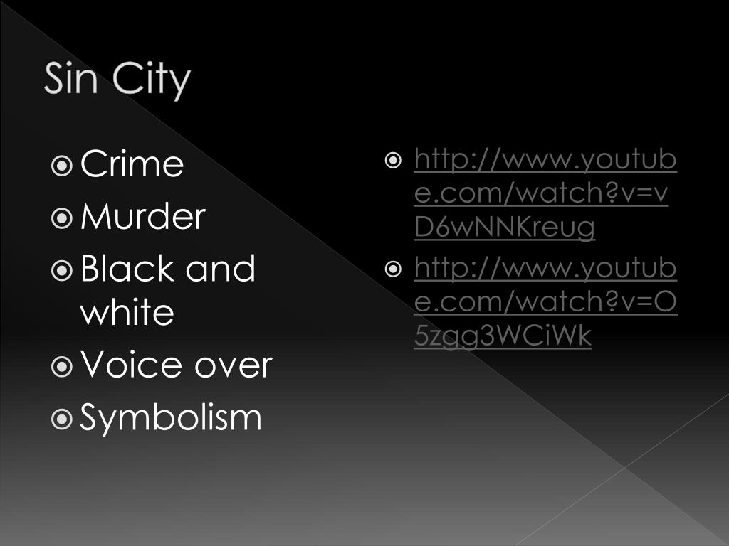 Sin City • Crime • Murder • Black and white • Voice over • Symbolism • http://www.youtube.com/watch?v=vD6wNNKreug • http://www.youtube.com/watch?v=O5zgg3WCiWk