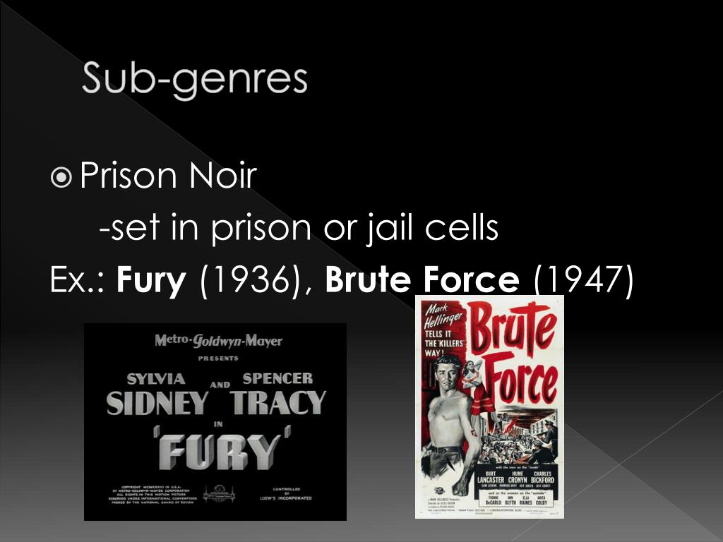 Sub-genres • Prison Noir -set in prison or jail cells Ex.: Fury (1936), Brute Force (1947)