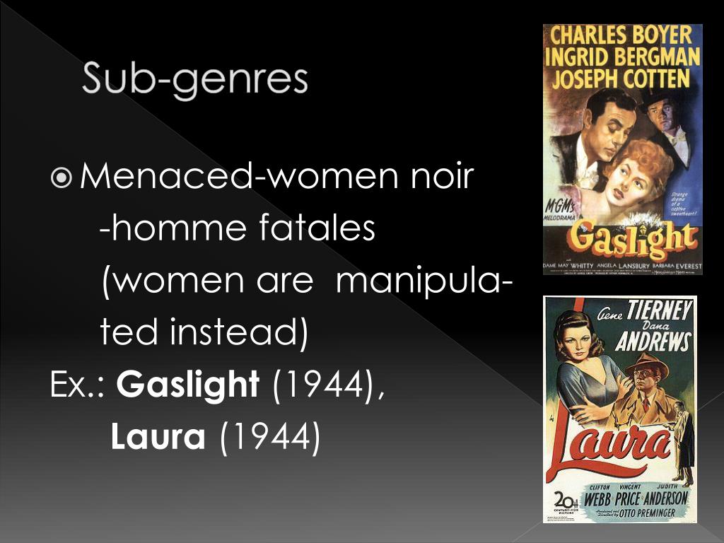 Sub-genres • Menaced-women noir -homme fatales (women are manipula- ted instead) Ex.: Gaslight (1944), Laura (1944)