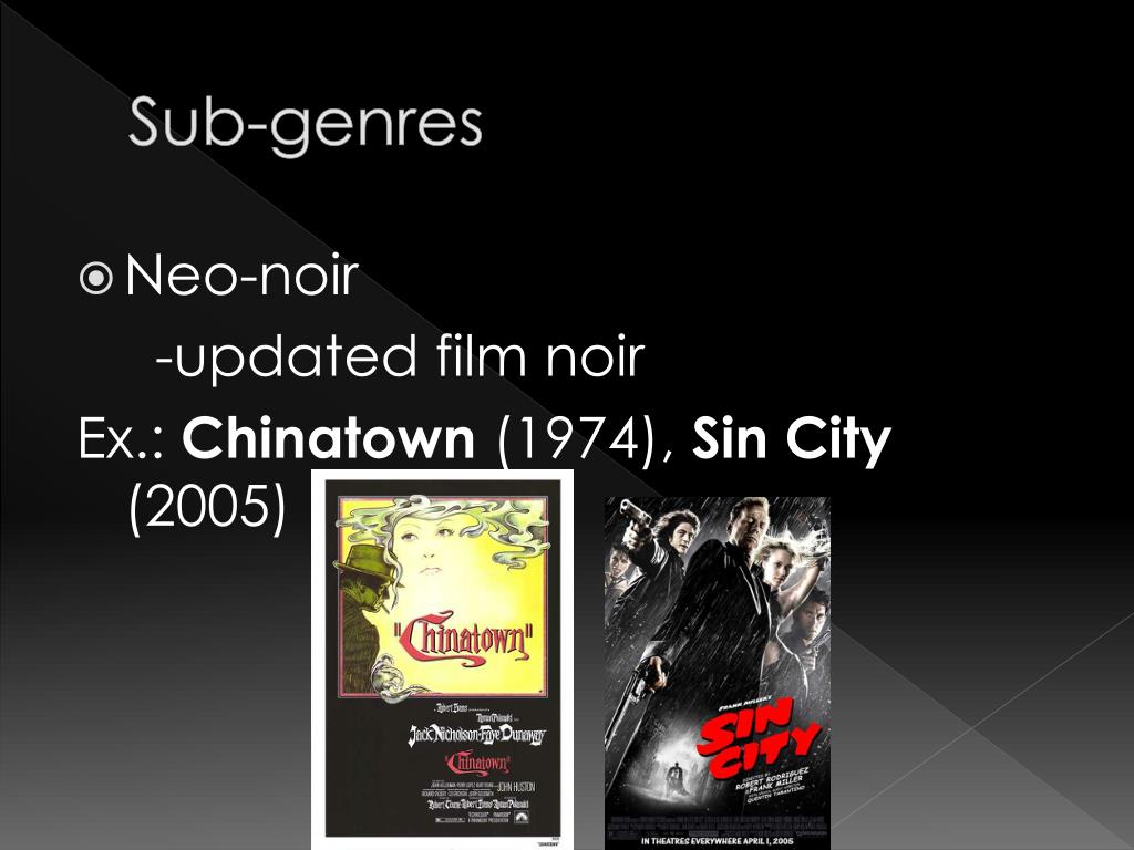Sub-genres • Neo-noir -updated film noir Ex.: Chinatown (1974), Sin City (2005)