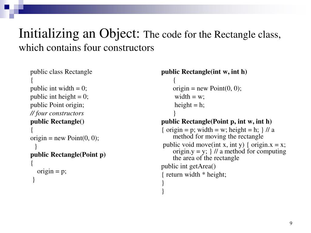 public class Rectangle { public int width = 0; public int height = 0; public Point origin; // four constructors public Rectangle() { origin = new Point(0, 0); } public Rectangle(Point p) { origin = p; } public Rectangle(int w, int h) { origin = new Point(0, 0); width = w; height = h; } public Rectangle(Point p, int w, int h) { origin = p; width = w; height = h; } // a method for moving the rectangle public void move(int x, int y) { origin.x = x; origin.y = y; } // a method for computing the area of the rectangle public int getArea() { return width * height; } } Initializing an Object: The code for the Rectangle class, which contains four constructors