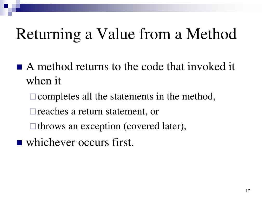 Returning a Value from a Method • A method returns to the code that invoked it when it • completes all the statements in the method, • reaches a return statement, or • throws an exception (covered later), • whichever occurs first.