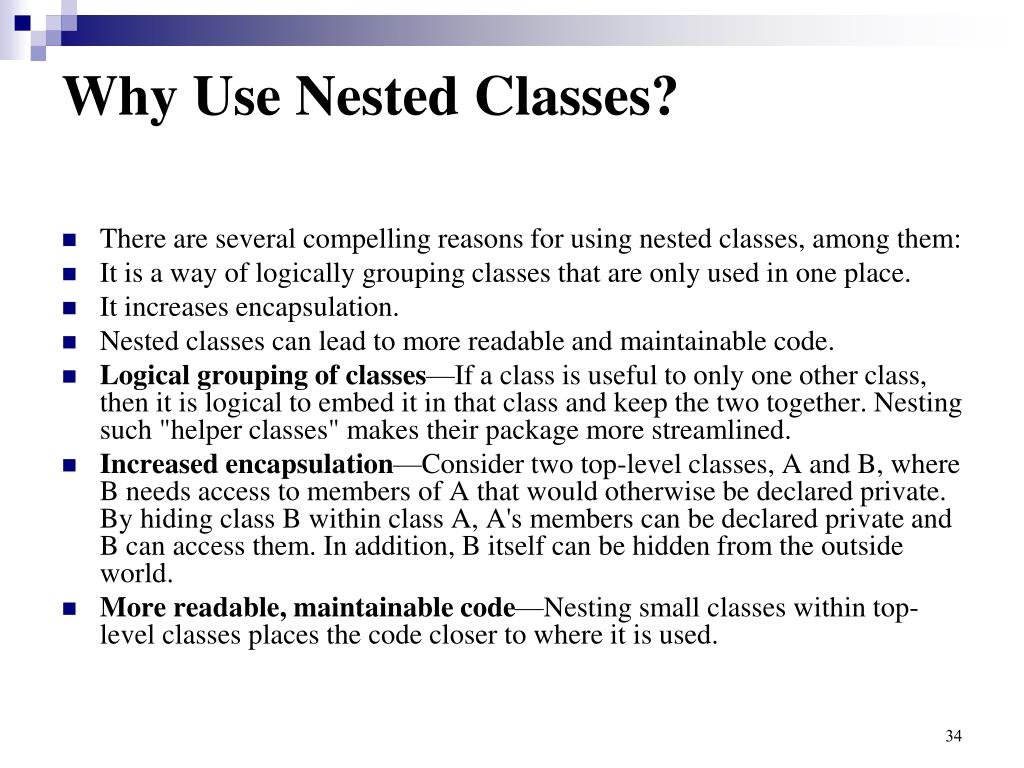 Why Use Nested Classes? • There are several compelling reasons for using nested classes, among them: • It is a way of logically grouping classes that are only used in one place. • It increases encapsulation. • Nested classes can lead to more readable and maintainable code. • Logical grouping of classes—If a class is useful to only one other class, then it is logical to embed it in that class and keep the two together. Nesting such "helper classes" makes their package more streamlined. • Increased encapsulation—Consider two top-level classes, A and B, where B needs access to members of A that would otherwise be declared private. By hiding class B within class A, A's members can be declared private and B can access them. In addition, B itself can be hidden from the outside world. • More readable, maintainable code—Nesting small classes within top-level classes places the code closer to where it is used.