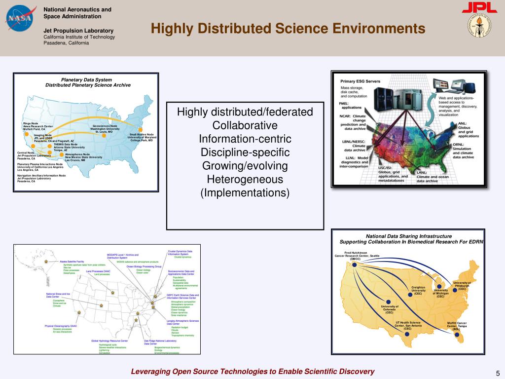 Highly Distributed Science Environments Highly distributed/federated Collaborative Information-centric Discipline-specific Growing/evolving Heterogeneous (Implementations) Leveraging Open Source Technologies to Enable Scientific Discovery