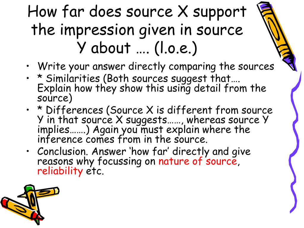 How far does source X support the impression given in source Y about …. (l.o.e.) • Write your answer directly comparing the sources • * Similarities (Both sources suggest that…. Explain how they show this using detail from the source) • * Differences (Source X is different from source Y in that source X suggests……, whereas source Y implies…….) Again you must explain where the inference comes from in the source. • Conclusion. Answer ‘how far’ directly and give reasons why focussing on nature of source, reliability etc.