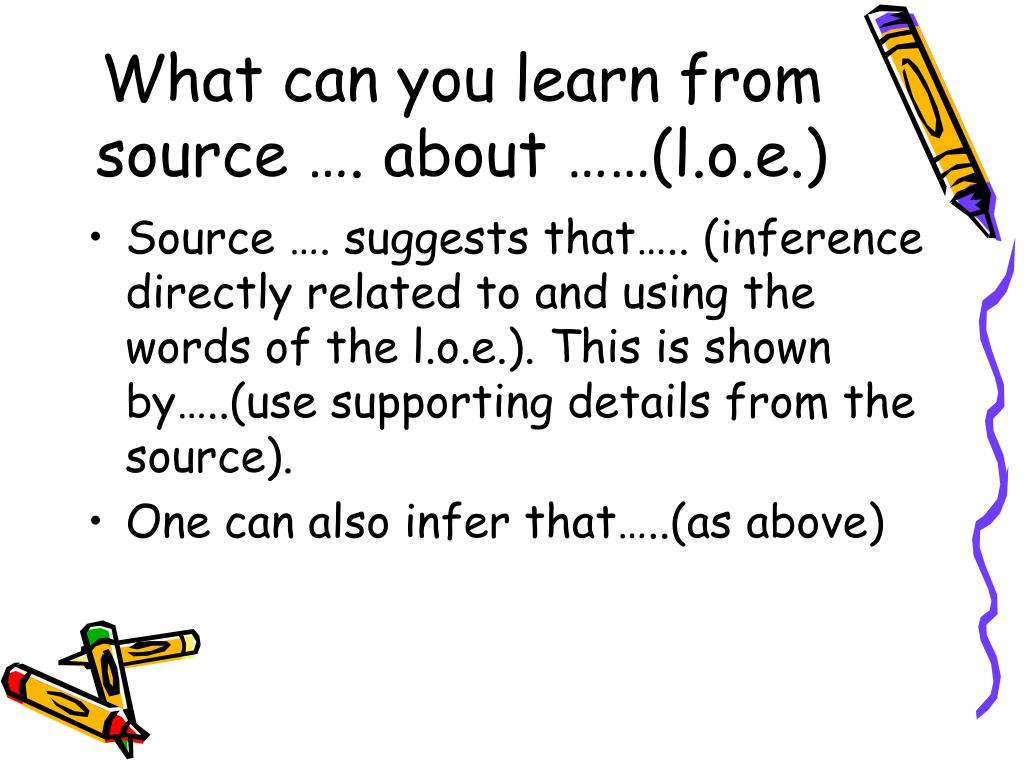 What can you learn from source …. about ……(l.o.e.) • Source …. suggests that….. (inference directly related to and using the words of the l.o.e.). This is shown by…..(use supporting details from the source). • One can also infer that…..(as above)