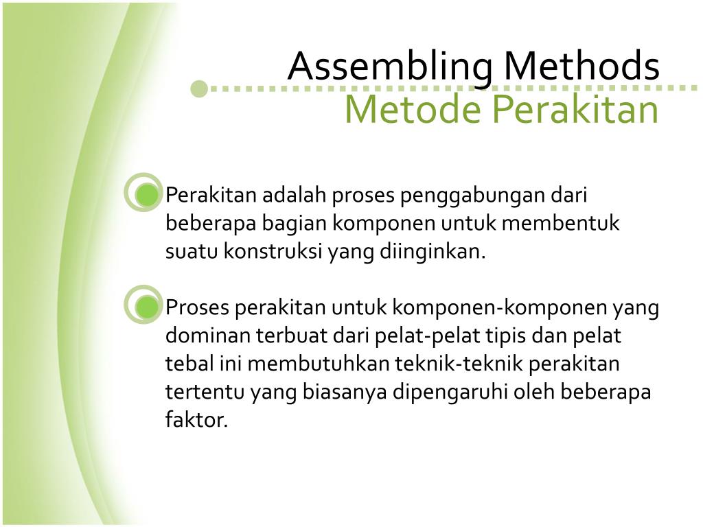 Assembling Methods. Yusron Sugiarto , S.TP, MP, MSc. Assembling Methods. Metode Perakitan. Perakitan adalah proses penggabungan dari beberapa bagian komponen untuk membentuk suatu konstruksi yang diinginkan .