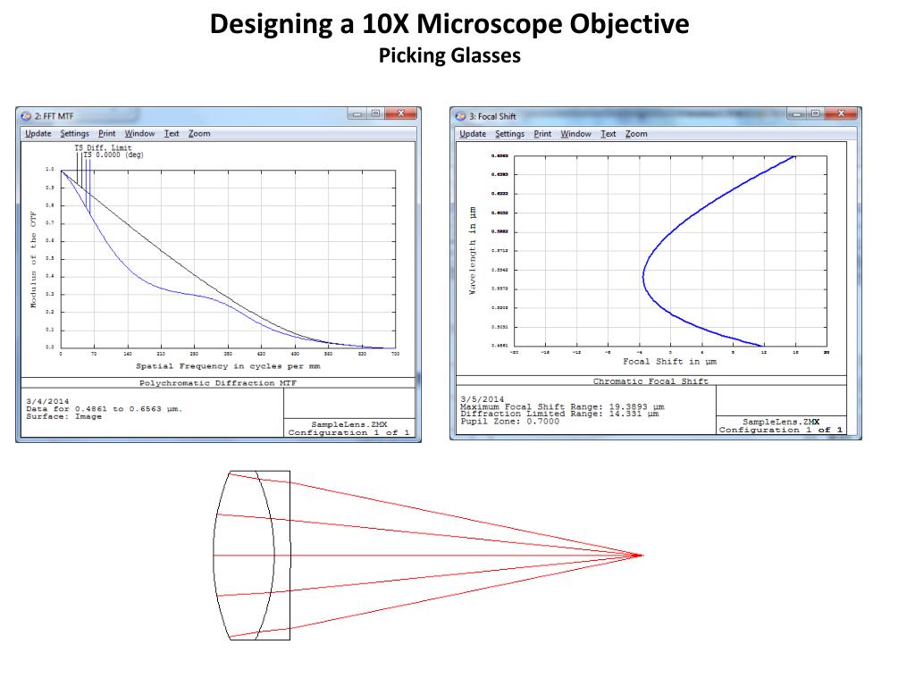 Designing a 10X Microscope Objective Starting Solutions for Zemax Using the Paraxial Achromat construction equations: And the glass parameters: N-SSK8: Nd = 1.617728 Vd = 49.8292 N-SF10: Nd = 1.728277 Vd = 28.5326 We get the following prescriptions: (Diameters to accommodate h1, h2 ) Achromat #1: (f=18.75mm) f1 = 8.0136 mm f2 = -13.995 mm R1 = 9.9004 R2 = -345.9 Diameter: 6mm Achromat #2: (f = 30 mm) f1 = 12.822 mm f2 = -22.392 mm R1 =15.8407 R2 = -553.44 Diameter: 9mm