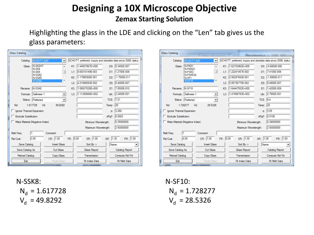 Designing a 10X Microscope Objective Zemax Starting Solution Highlighting the glass in the LDE and clicking on the “Len” tab gives us the glass parameters: N-SSK8: Nd = 1.617728 Vd = 49.8292 N-SF10: Nd = 1.728277 Vd = 28.5326