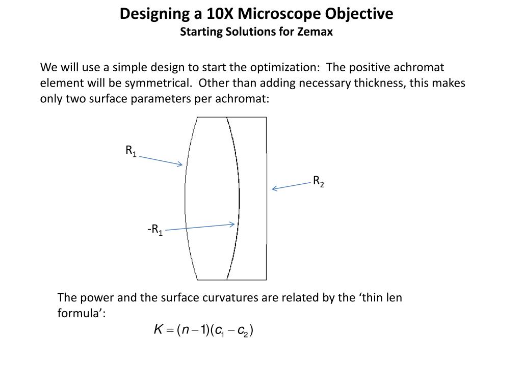 Designing a 10X Microscope Objective Starting Solutions for Zemax We will use a simple design to start the optimization: The positive achromat element will be symmetrical. Other than adding necessary thickness, this makes only two surface parameters per achromat: R1 R2 -R1 The power and the surface curvatures are related by the ‘thin len formula’:
