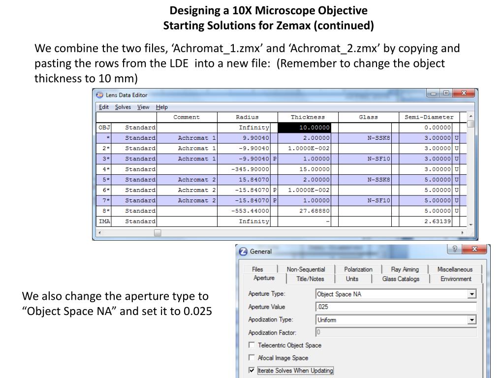 Designing a 10X Microscope Objective Starting Solutions for Zemax (continued) We combine the two files, ‘Achromat_1.zmx’ and ‘Achromat_2.zmx’ by copying and pasting the rows from the LDE into a new file: (Remember to change the object thickness to 10 mm) We also change the aperture type to “Object Space NA” and set it to 0.025