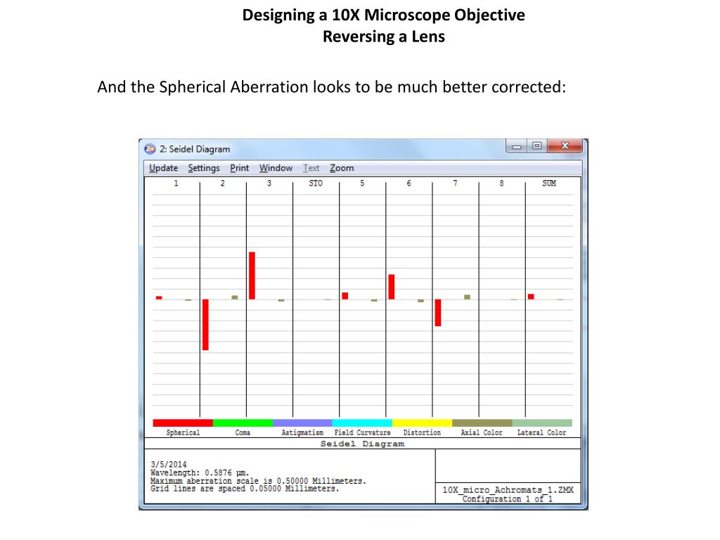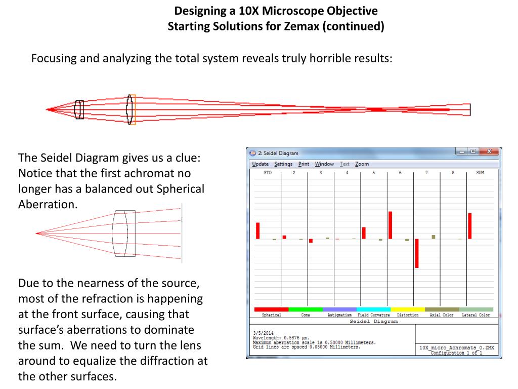 Designing a 10X Microscope Objective Starting Solutions for Zemax (continued) Focusing and analyzing the total system reveals truly horrible results: The Seidel Diagram gives us a clue: Notice that the first achromat no longer has a balanced out Spherical Aberration. Due to the nearness of the source, most of the refraction is happening at the front surface, causing that surface’s aberrations to dominate the sum. We need to turn the lens around to equalize the diffraction at the other surfaces.