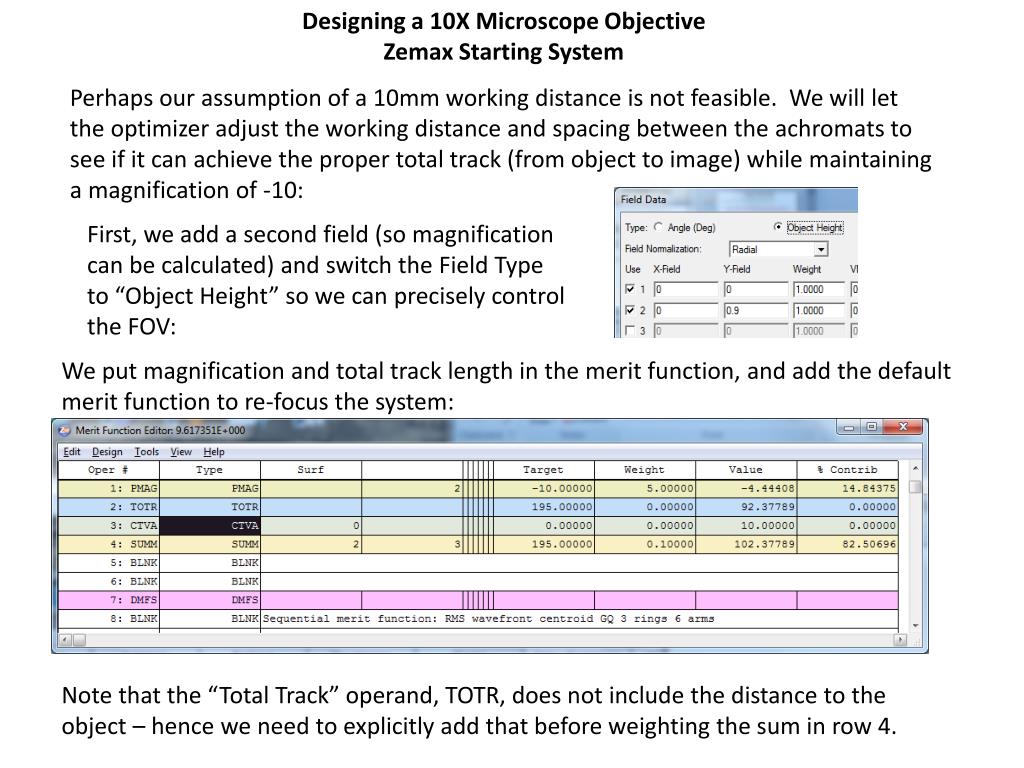 Designing a 10X Microscope Objective Zemax Starting System Perhaps our assumption of a 10mm working distance is not feasible. We will let the optimizer adjust the working distance and spacing between the achromats to see if it can achieve the proper total track (from object to image) while maintaining a magnification of -10: First, we add a second field (so magnification can be calculated) and switch the Field Type to “Object Height” so we can precisely control the FOV: We put magnification and total track length in the merit function, and add the default merit function to re-focus the system: Note that the “Total Track” operand, TOTR, does not include the distance to the object – hence we need to explicitly add that before weighting the sum in row 4.