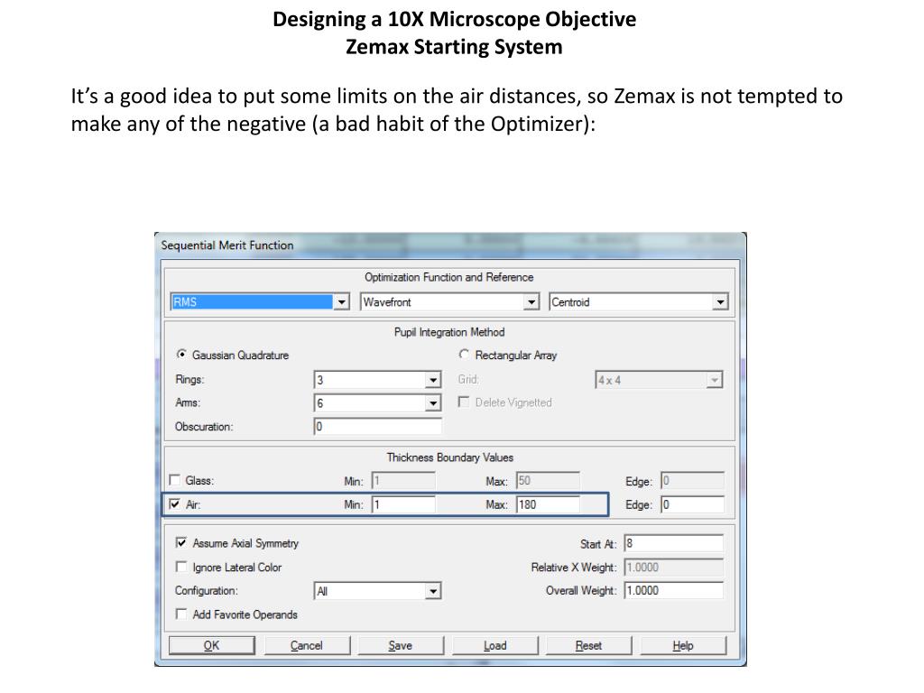Designing a 10X Microscope Objective Zemax Starting System It’s a good idea to put some limits on the air distances, so Zemax is not tempted to make any of the negative (a bad habit of the Optimizer):