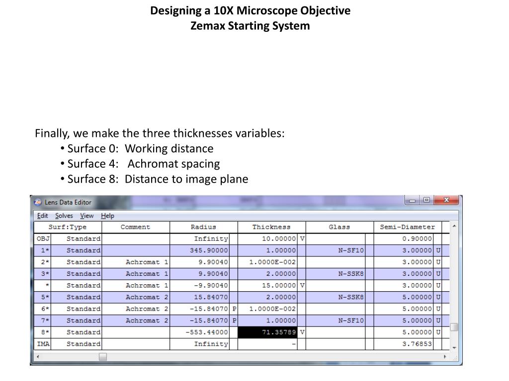 Designing a 10X Microscope Objective Zemax Starting System • Finally, we make the three thicknesses variables: • Surface 0: Working distance • Surface 4: Achromat spacing • Surface 8: Distance to image plane