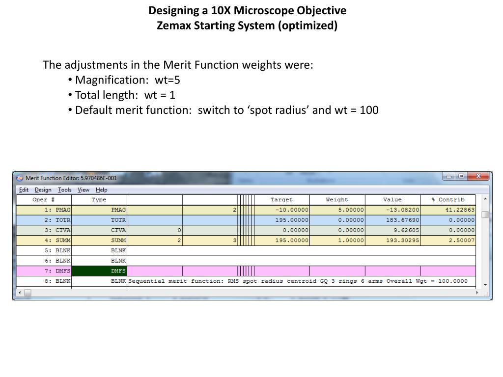 Designing a 10X Microscope Objective Zemax Starting System (optimized) The optimizer doesn’t find a ‘best’ system, but a series of trade-offs, depending on how the weights are adjusted. After some experimenting with the merit function, this system was chosen as ‘close enough’ to start the real optimization: Working distance: 9.6mm Lens spacing: 5mm Magnification: -13 The MTF is not too bad: