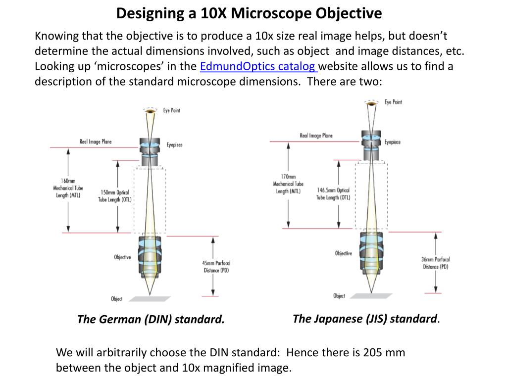 Designing a 10X Microscope Objective Knowing that the objective is to produce a 10x size real image helps, but doesn’t determine the actual dimensions involved, such as object and image distances, etc. Looking up ‘microscopes’ in the EdmundOptics catalog website allows us to find a description of the standard microscope dimensions. There are two: The Japanese (JIS) standard. The German (DIN) standard. We will arbitrarily choose the DIN standard: Hence there is 205 mm between the object and 10x magnified image.