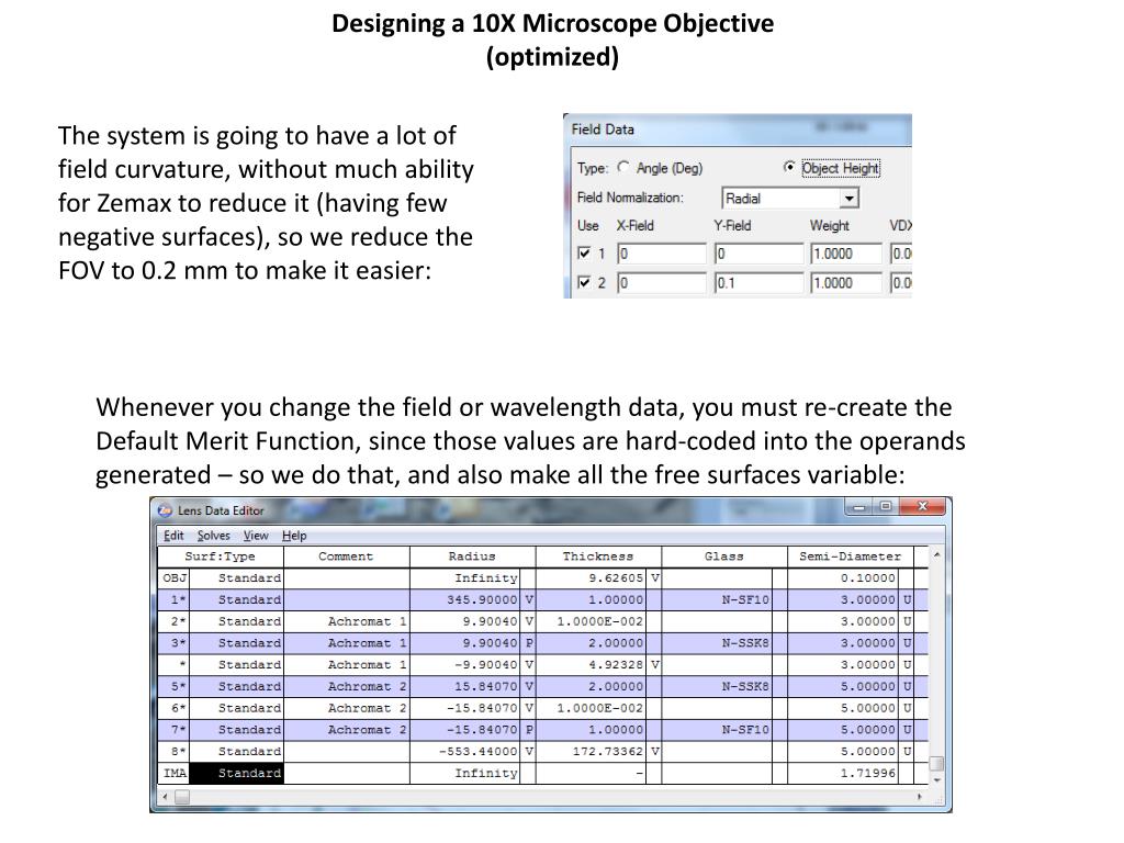 Designing a 10X Microscope Objective (optimized) The system is going to have a lot of field curvature, without much ability for Zemax to reduce it (having few negative surfaces), so we reduce the FOV to 0.2 mm to make it easier: Whenever you change the field or wavelength data, you must re-create the Default Merit Function, since those values are hard-coded into the operands generated – so we do that, and also make all the free surfaces variable: