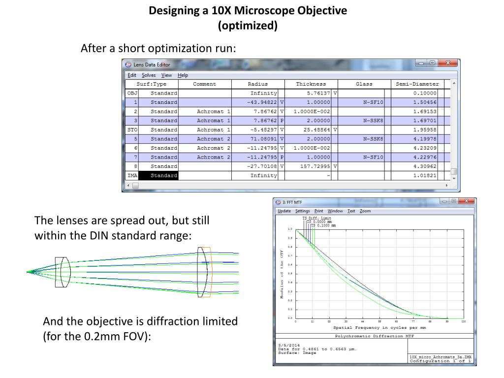 Designing a 10X Microscope Objective (optimized) After a short optimization run: The lenses are spread out, but still within the DIN standard range: And the objective is diffraction limited (for the 0.2mm FOV):