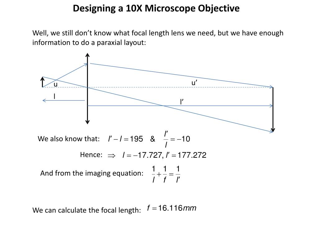 Designing a 10X Microscope Objective Well, we still don’t know what focal length lens we need, but we have enough information to do a paraxial layout: u’ u l l’ We also know that: Hence: And from the imaging equation: We can calculate the focal length: