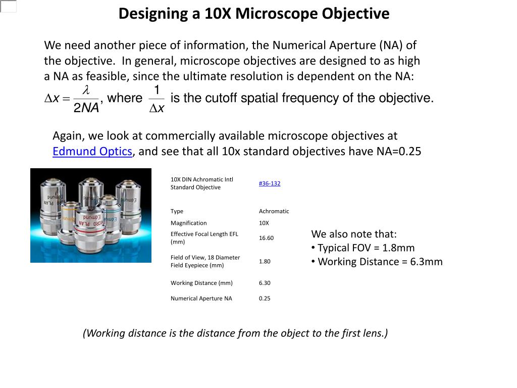 Designing a 10X Microscope Objective We need another piece of information, the Numerical Aperture (NA) of the objective. In general, microscope objectives are designed to as high a NA as feasible, since the ultimate resolution is dependent on the NA: Again, we look at commercially available microscope objectives at Edmund Optics, and see that all 10x standard objectives have NA=0.25 • We also note that: • Typical FOV = 1.8mm • Working Distance = 6.3mm (Working distance is the distance from the object to the first lens.)