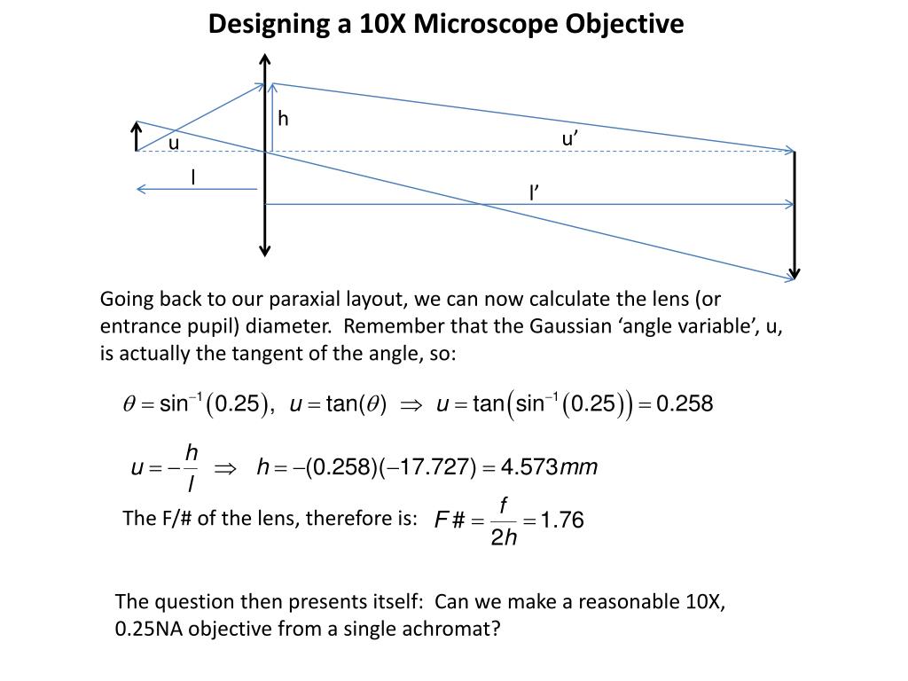 Designing a 10X Microscope Objective u’ u l h l’ Going back to our paraxial layout, we can now calculate the lens (or entrance pupil) diameter. Remember that the Gaussian ‘angle variable’, u, is actually the tangent of the angle, so: The F/# of the lens, therefore is: The question then presents itself: Can we make a reasonable 10X, 0.25NA objective from a single achromat?