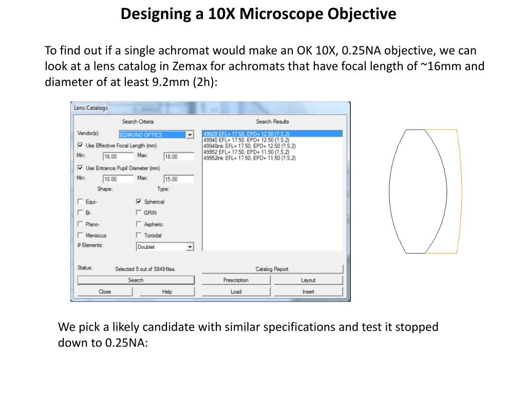 Designing a 10X Microscope Objective To find out if a single achromat would make an OK 10X, 0.25NA objective, we can look at a lens catalog in Zemax for achromats that have focal length of ~16mm and diameter of at least 9.2mm (2h): We pick a likely candidate with similar specifications and test it stopped down to 0.25NA: