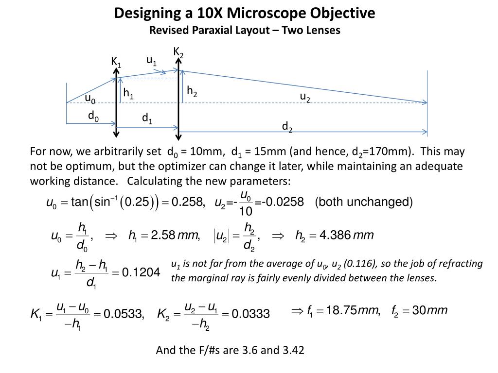 Designing a 10X Microscope Objective Revised Paraxial Layout – Two Lenses K2 u1 K1 h2 h1 u2 u0 d0 d1 d2 For now, we arbitrarily set d0 = 10mm, d1 = 15mm (and hence, d2=170mm). This may not be optimum, but the optimizer can change it later, while maintaining an adequate working distance. Calculating the new parameters: u1 is not far from the average of u0, u2 (0.116), so the job of refracting the marginal ray is fairly evenly divided between the lenses. And the F/#s are 3.6 and 3.42