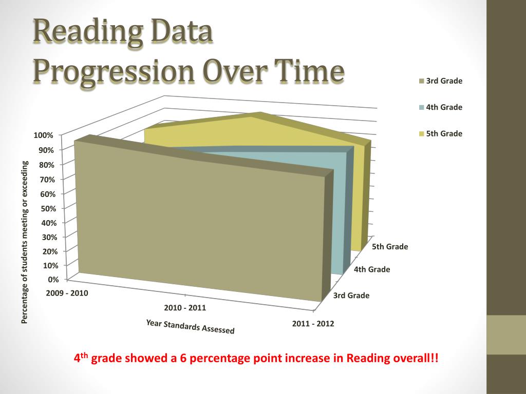 Reading Data Progression Over Time Percentage of students meeting or exceeding Year Standards Assessed 4th grade showed a 6 percentage point increase in Reading overall!!