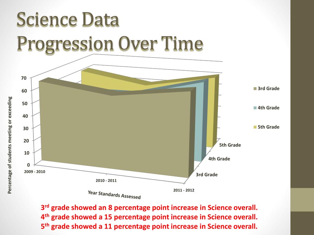 Science Data Progression Over Time Percentage of students meeting or exceeding Year Standards Assessed 3rd grade showed an 8 percentage point increase in Science overall. 4thgrade showed a 15 percentage point increase in Science overall. 5thgrade showed a 11 percentage point increase in Science overall.