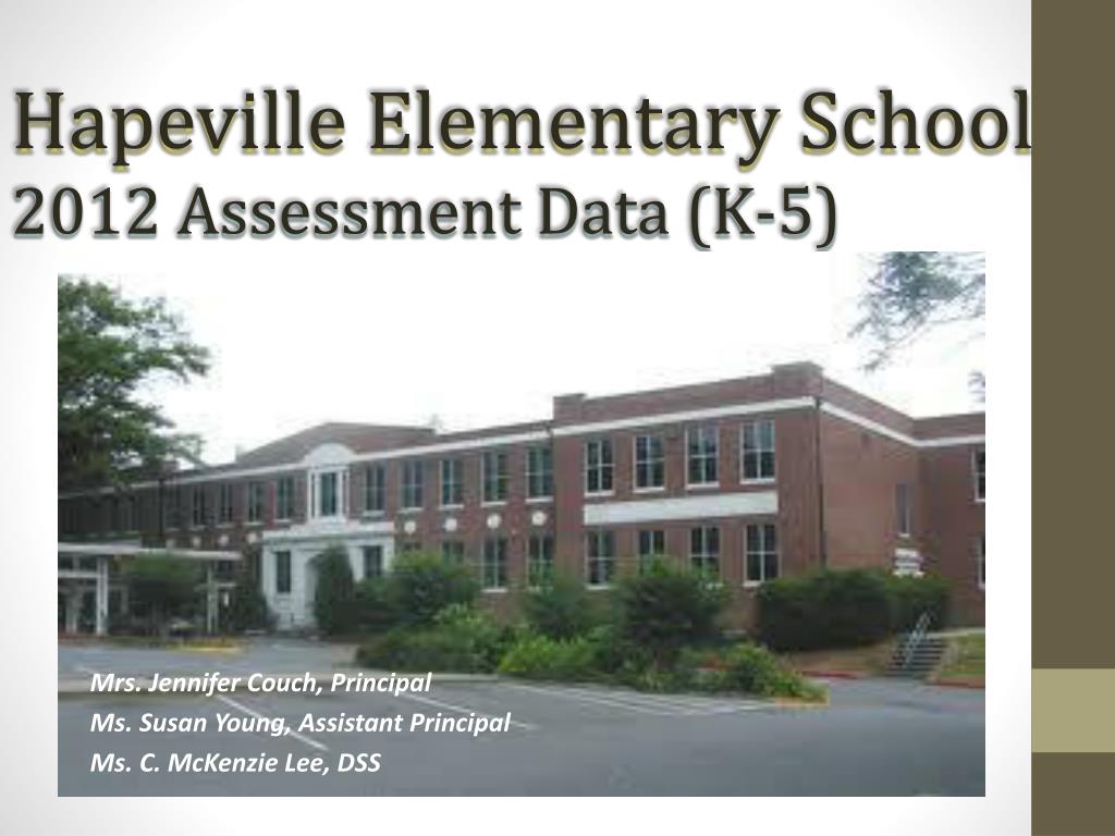 Hapeville Elementary School2012 Assessment Data (K-5) Mrs. Jennifer Couch, Principal Ms. Susan Young, Assistant Principal Ms. C. McKenzie Lee, DSS