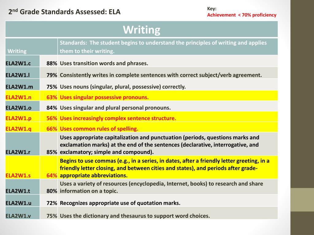 Key: Achievement < 70% proficiency 2nd Grade Standards Assessed: ELA