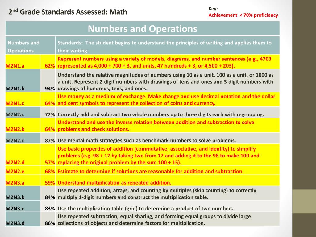 Key: Achievement < 70% proficiency 2nd Grade Standards Assessed: Math