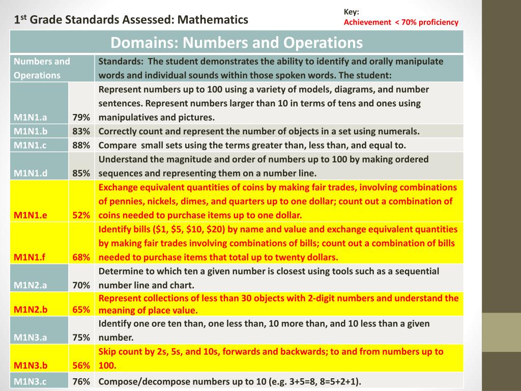 Key: Achievement < 70% proficiency 1st Grade Standards Assessed: Mathematics
