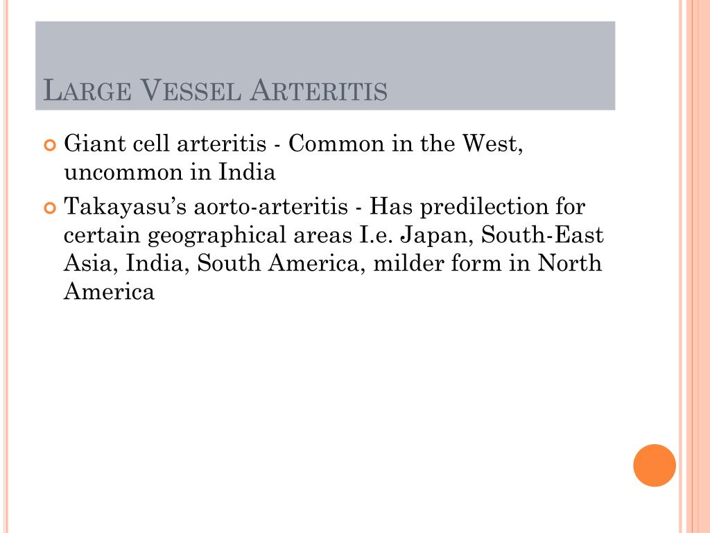 Large Vessel Arteritis • Giant cell arteritis - Common in the West, uncommon in India • Takayasu’s aorto-arteritis - Has predilection for certain geographical areas I.e. Japan, South-East Asia, India, South America, milder form in North America