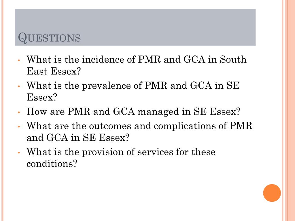Questions • What is the incidence of PMR and GCA in South East Essex? • What is the prevalence of PMR and GCA in SE Essex? • How are PMR and GCA managed in SE Essex? • What are the outcomes and complications of PMR and GCA in SE Essex? • What is the provision of services for these conditions?