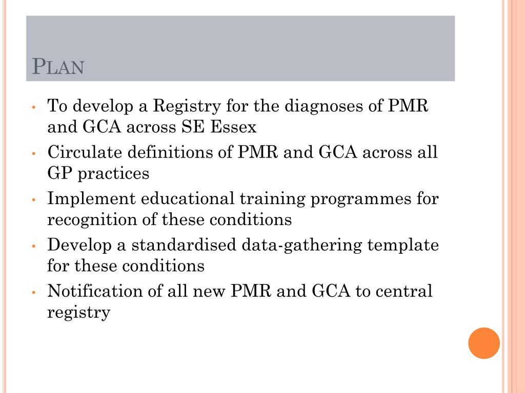Plan • To develop a Registry for the diagnoses of PMR and GCA across SE Essex • Circulate definitions of PMR and GCA across all GP practices • Implement educational training programmes for recognition of these conditions • Develop a standardised data-gathering template for these conditions • Notification of all new PMR and GCA to central registry