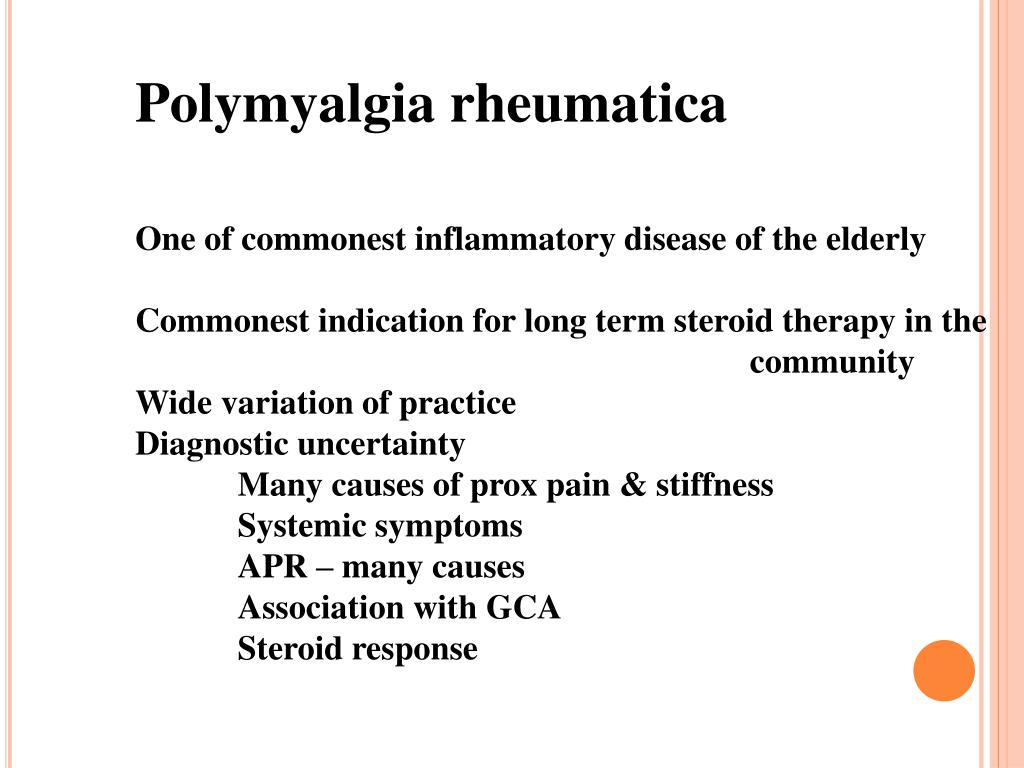 Polymyalgia rheumatica One of commonest inflammatory disease of the elderly Commonest indication for long term steroid therapy in the community Wide variation of practice Diagnostic uncertainty Many causes of prox pain & stiffness Systemic symptoms APR – many causes Association with GCA Steroid response