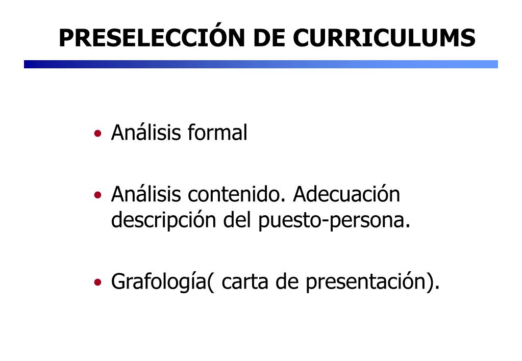 PRESELECCIÓN DE CURRICULUMS • Análisis formal • Análisis contenido. Adecuación descripción del puesto-persona. • Grafología( carta de presentación).
