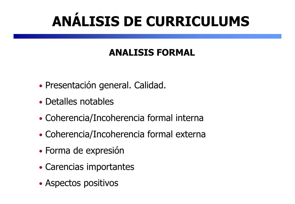 ANÁLISIS DE CURRICULUMS • ANALISIS FORMAL • Presentación general. Calidad. • Detalles notables • Coherencia/Incoherencia formal interna • Coherencia/Incoherencia formal externa • Forma de expresión • Carencias importantes • Aspectos positivos
