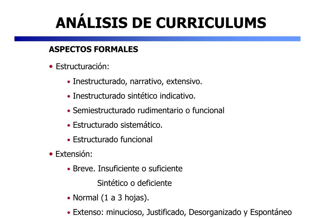 ANÁLISIS DE CURRICULUMS • ASPECTOS FORMALES • Estructuración: • Inestructurado, narrativo, extensivo. • Inestructurado sintético indicativo. • Semiestructurado rudimentario o funcional • Estructurado sistemático. • Estructurado funcional • Extensión: • Breve. Insuficiente o suficiente • Sintético o deficiente • Normal (1 a 3 hojas). • Extenso: minucioso, Justificado, Desorganizado y Espontáneo