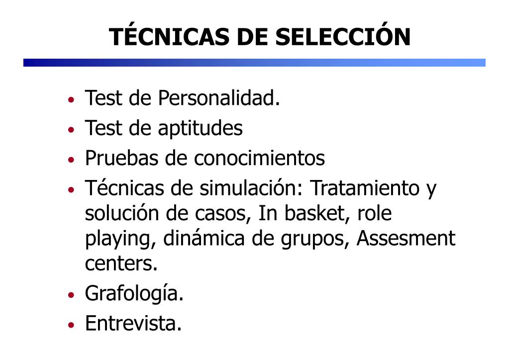 TÉCNICAS DE SELECCIÓN • Test de Personalidad. • Test de aptitudes • Pruebas de conocimientos • Técnicas de simulación: Tratamiento y solución de casos, In basket, role playing, dinámica de grupos, Assesment centers. • Grafología. • Entrevista.