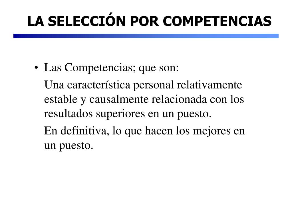 LA SELECCIÓN POR COMPETENCIAS • Las Competencias; que son: Una característica personal relativamente estable y causalmente relacionada con los resultados superiores en un puesto. En definitiva, lo que hacen los mejores en un puesto.