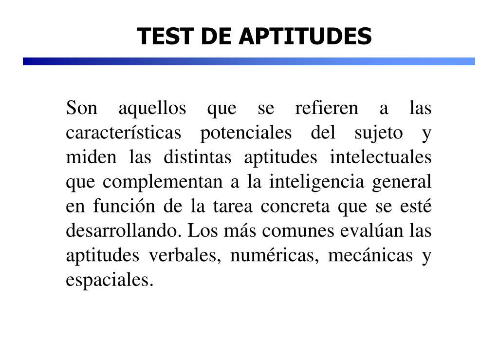 TEST DE APTITUDES Son aquellos que se refieren a las características potenciales del sujeto y miden las distintas aptitudes intelectuales que complementan a la inteligencia general en función de la tarea concreta que se esté desarrollando. Los más comunes evalúan las aptitudes verbales, numéricas, mecánicas y espaciales.