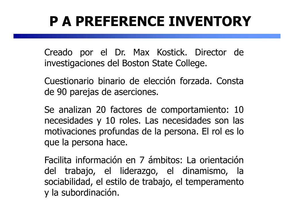 P A PREFERENCE INVENTORY Creado por el Dr. Max Kostick. Director de investigaciones del Boston State College. Cuestionario binario de elección forzada. Consta de 90 parejas de aserciones. Se analizan 20 factores de comportamiento: 10 necesidades y 10 roles. Las necesidades son las motivaciones profundas de la persona. El rol es lo que la persona hace. Facilita información en 7 ámbitos: La orientación del trabajo, el liderazgo, el dinamismo, la sociabilidad, el estilo de trabajo, el temperamento y la subordinación.